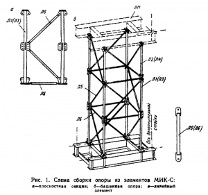 Металлоконструкции стоечного типа принято использовать для устройства вспомогательных опор, подкрановых эстакад, опор для наложения пролетных сооружений, рабочих мостов и т.д. Чтобы собрать башню, используются такие элементы: