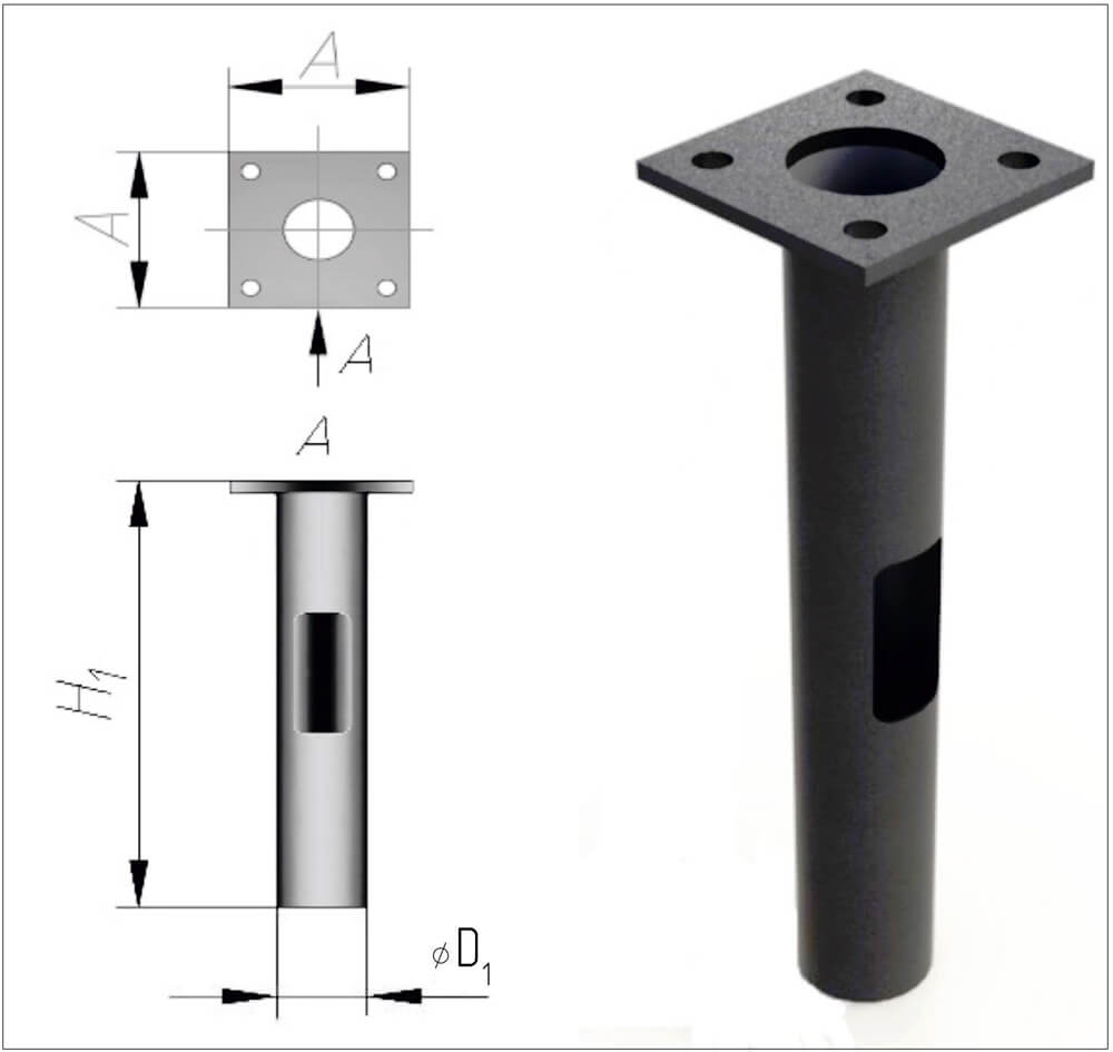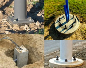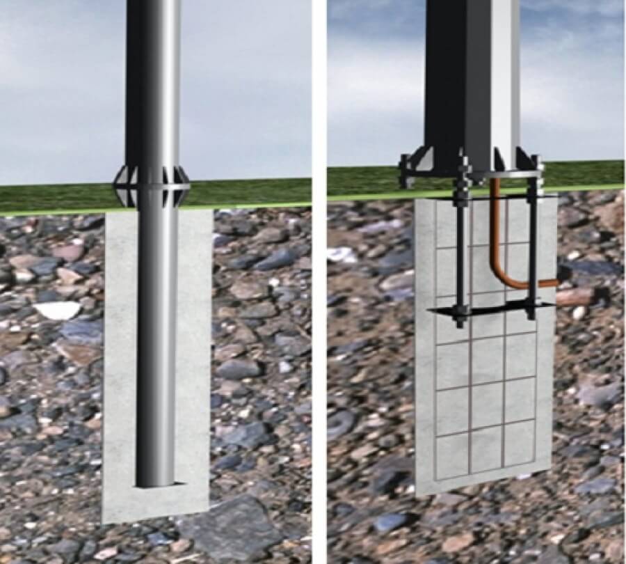 Железобетонное основание должно быть выполнено на закладном элементе, бетонируемом в землю. Параметры выбираемой ЖБ конструкции зависят от выбранного грунта. Опора соединяется с закладной частью при помощи фланца или шпилек.Установка опор выполняется при помощи: